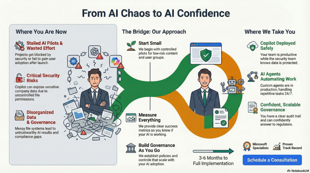 We start with a conversation about your Microsoft 365 setup, your AI goals, and your constraints (timeline, budget, compliance requirements).