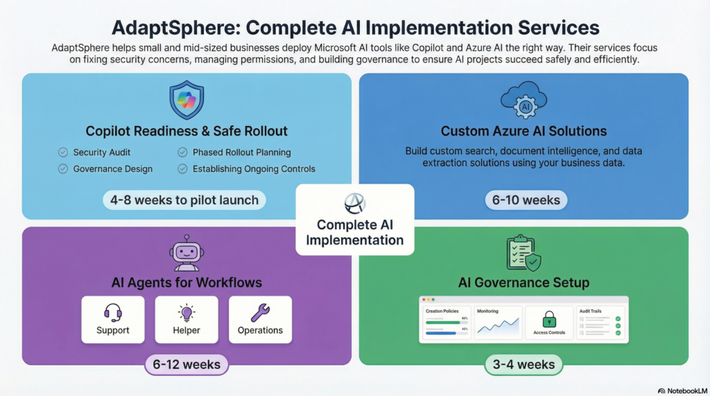 Adaptsphere helps small and mid-sized businesses deploy Microsoft AI tools safely and effectively. We specialize in Microsoft 365 Copilot rollouts, Azure AI solutions, custom agent development, and AI governance frameworks.